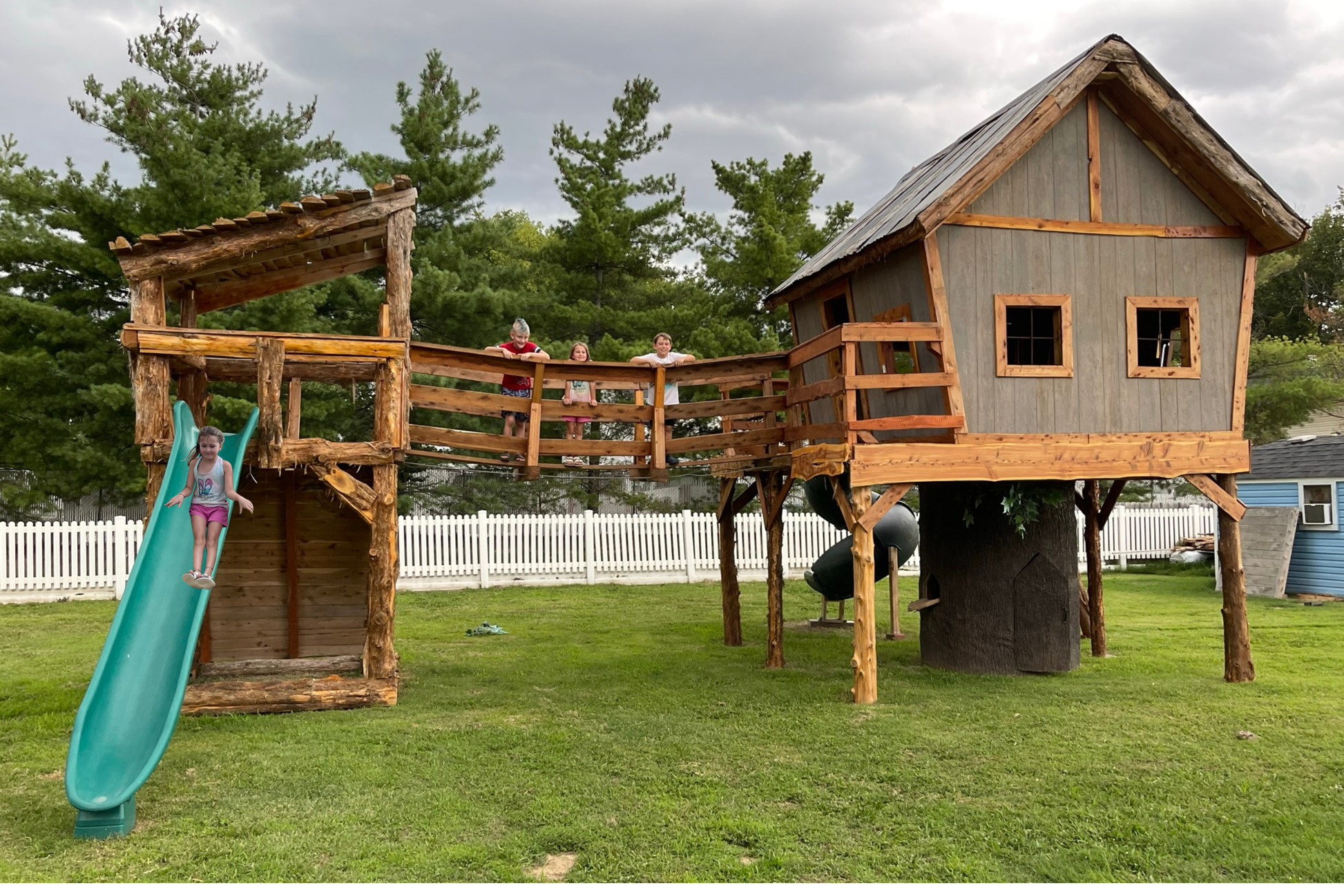 Experience the ultimate in outdoor play with our custom-built treehouses. This deluxe playset features a spacious 10' x 12' playhouse on top of our signature cedar tree base Let your imagination soar with our custom built treehouses! This treehouse playset includes a huge 10' x 12' playhouse with wrap around porch, rock walls, 12' suspension bridge, 6 x6 treehouse tower, , spiral tube slide, 14' straight slide and much more! Let us design your dream playset with a wrap-around porch, rock climbing walls, a connecting bridge, and a sturdy 6x6 treehouse tower. Enjoy thrilling adventures with both a spiral tube slide and a 14' straight slide. Trust our expertise to create the perfect playset tailored to your vision.